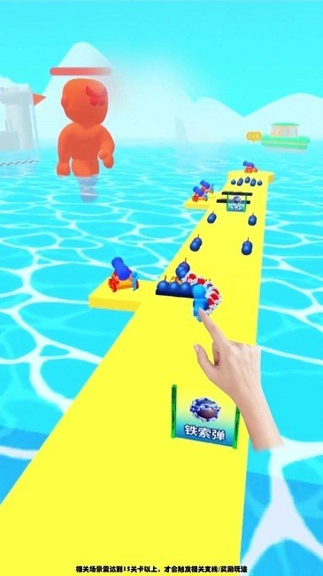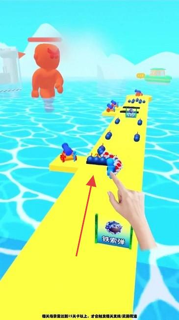 3、在水上跑道关卡,点击屏幕操作角色,避开炸弹等障碍,收集道具,借助工具跨越陷阱,向终点推进。