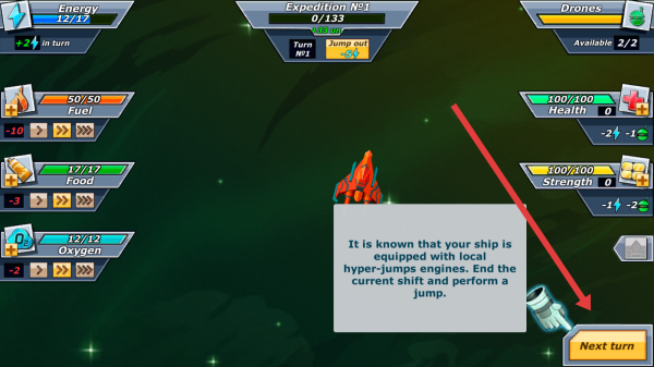 1、飞船已配备本地超空间跳跃引擎,点击Next-turn结束当前轮次,执行跳跃操作推进游戏进程。