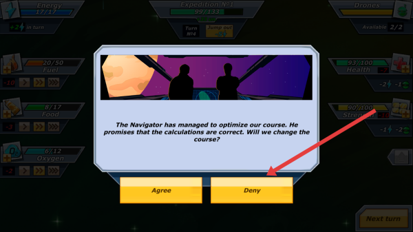 2、导航员优化航线并承诺计算正确,需要根据游玩策略选择Agree或Deny,决定是否更改航线。