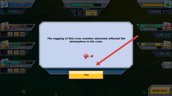 3、出现事件船员唠叨影响团队氛围,点击Yes处理该事件,维持船员状态,继续太空探险流程。