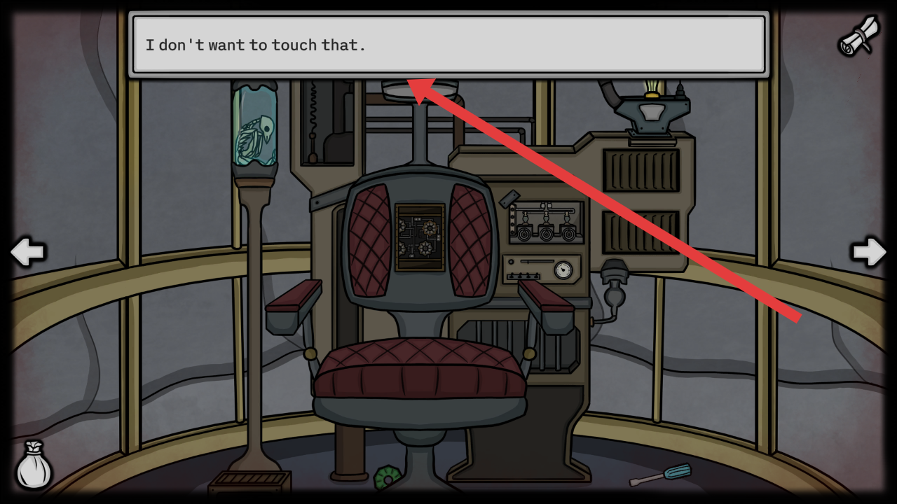 2、在实验室的场景中,角色对装置反馈I don't want to touch that,遵循提示暂不触碰,需要先转向其他线索。