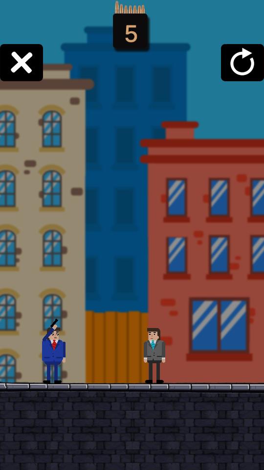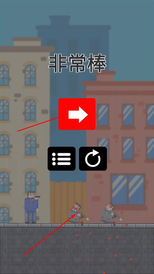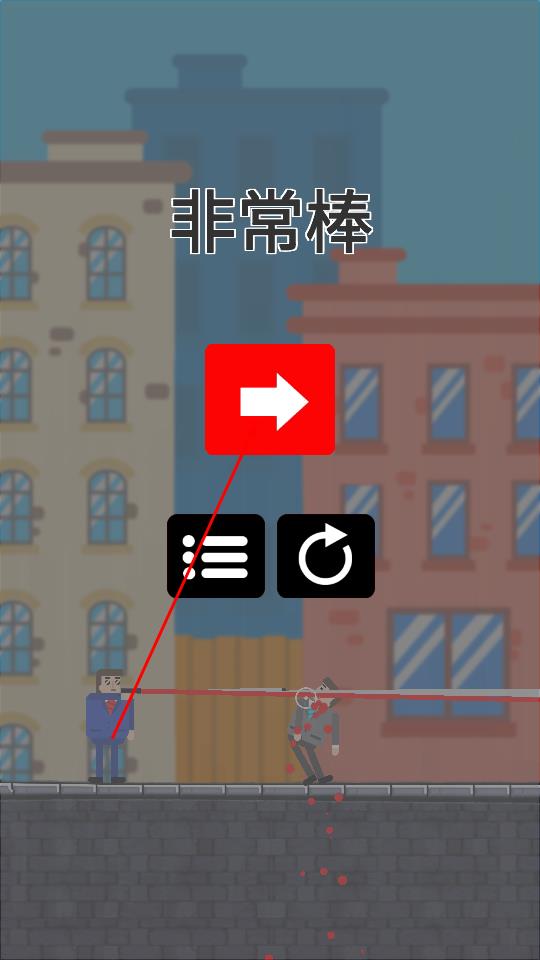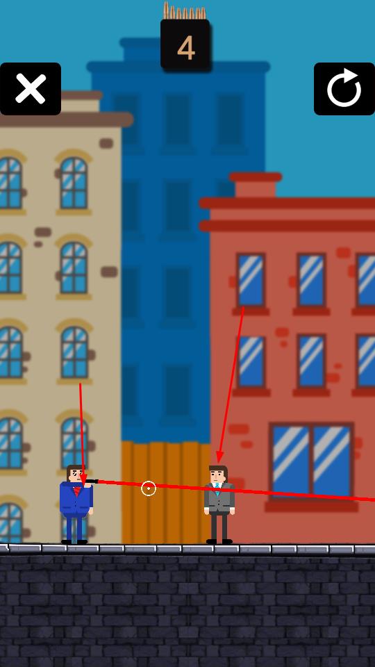 1、进入关卡界面,操控蓝色西装角色瞄准灰色目标,依据上方子弹数如数字4,点击发射开展攻击挑战。