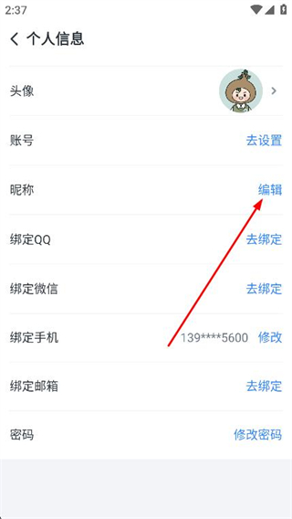 3、在个人信息页面找到昵称选项,点击右侧的编辑按钮。