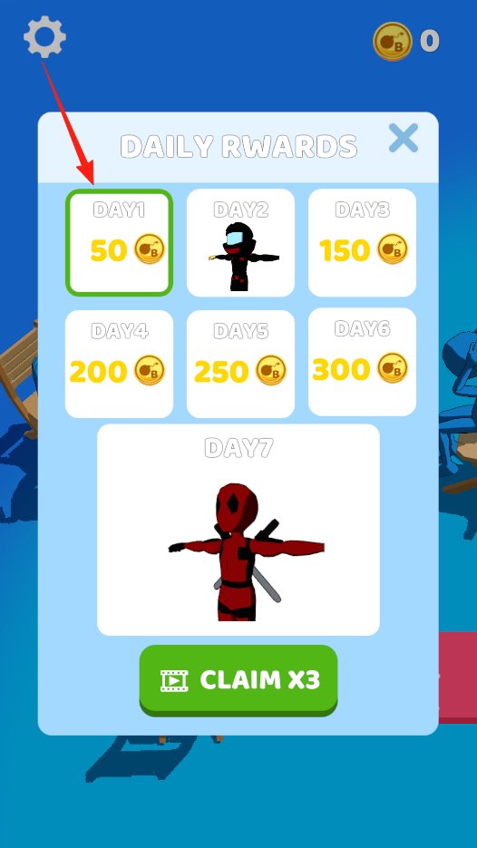 1、打开日常奖励界面,看到DAY1到DAY7的奖励,想领DAY1的50金币,直接点DAY1的格子,就能拿到当天奖励,连续登录还能解锁后面更丰富的奖励,比如角色皮肤。