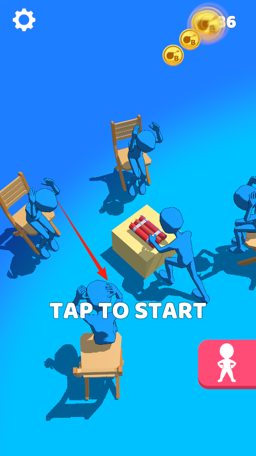 2、进入游戏场景,蓝色小人围着炸弹,屏幕有TAP TO START提示,点一下屏幕,开始游戏,想办法让小人躲开炸弹危险,或者拆除炸弹,过程中收集金币,看能闯过这关不。