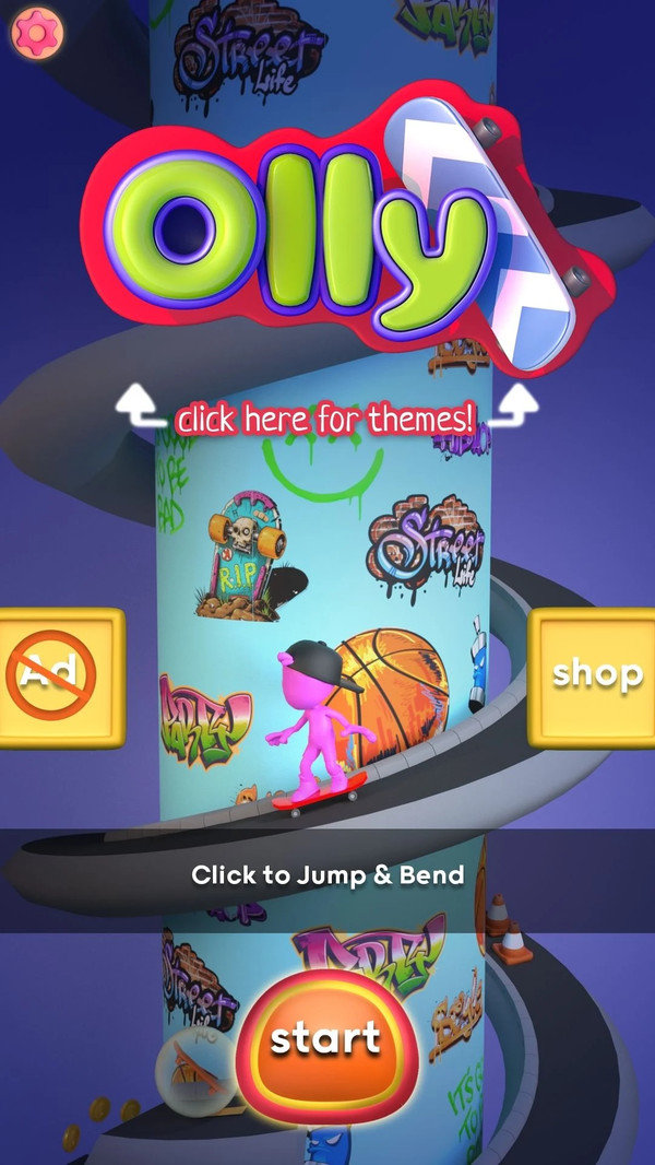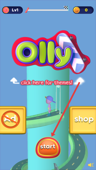 1、在进入到游戏后,通过点击主界面橙色start按钮,进入Lv1螺旋赛道,开启Olly的滑板跑酷挑战。