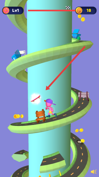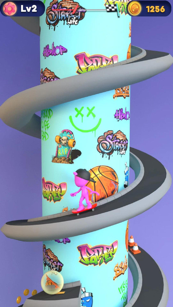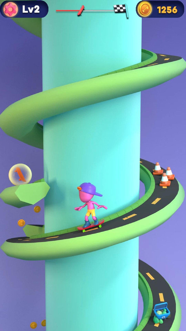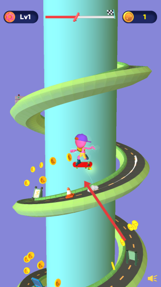 2、开始游戏后,点击屏幕操控角色滑滑板,沿螺旋道路收集金币,避让路锥等障碍,推进跑酷进程。