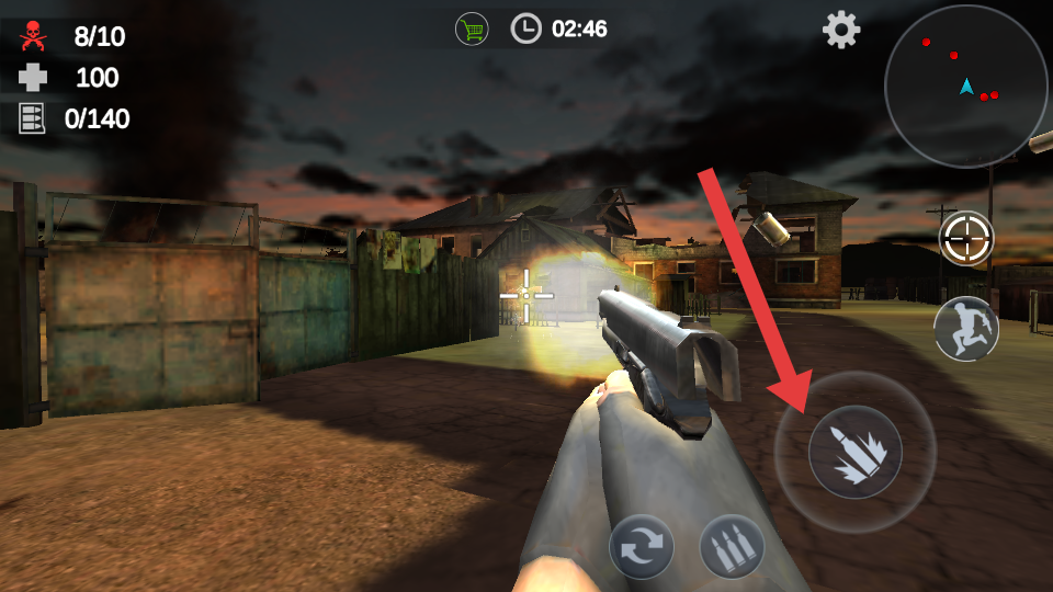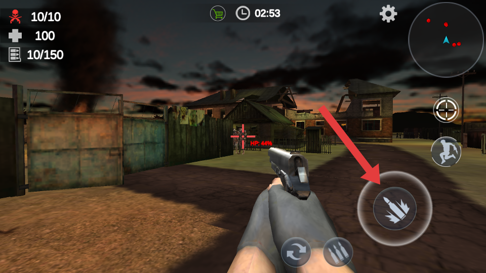 1、进入战斗,右侧带子弹图标的按键为技能键,瞄准远处敌人如HP 44%目标,点击释放,增强攻击效果。