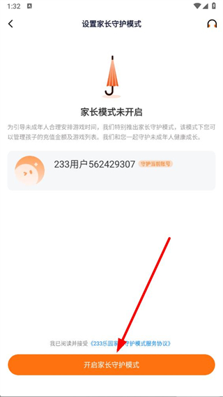 4、勾选我已阅读并接受家长守护模式服务协议后,点击开启家长守护模式即可完成设置。
