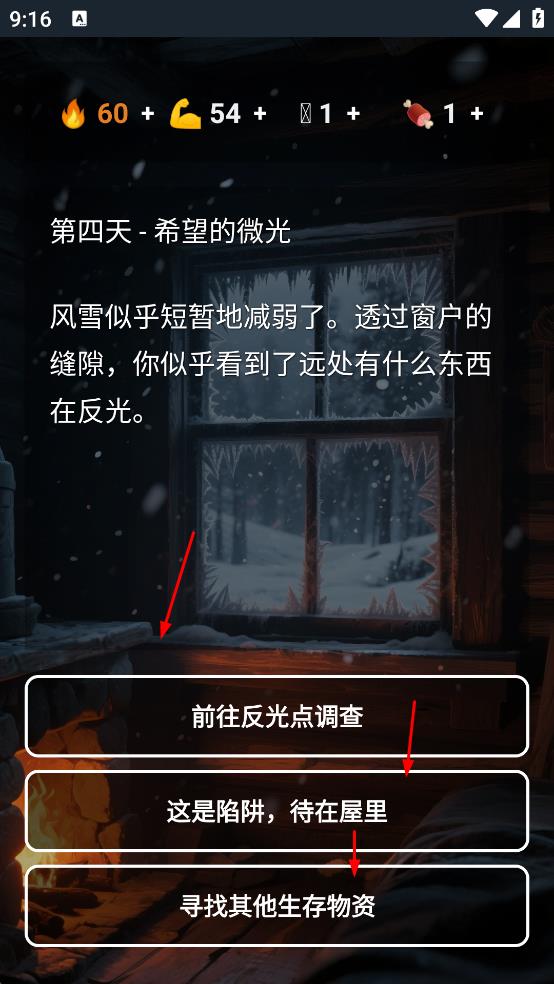 2、选择即时影响生存走向:每一次决策都即时反馈在生存状态上,选择冒雪外出可能找到食物却冻伤体温,选择留屋休息虽节省体力却可能耗尽木柴。