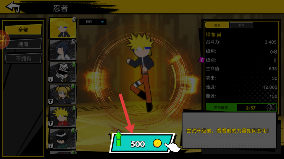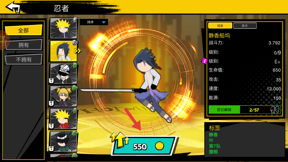1、进入游戏后,在角色列表中查看各Q版角色的战力面板,了解忍术伤害、防御值、敏捷度等核心属性,挑选战力适配当前对战难度的角色,搭配基础忍具提升初始战力。