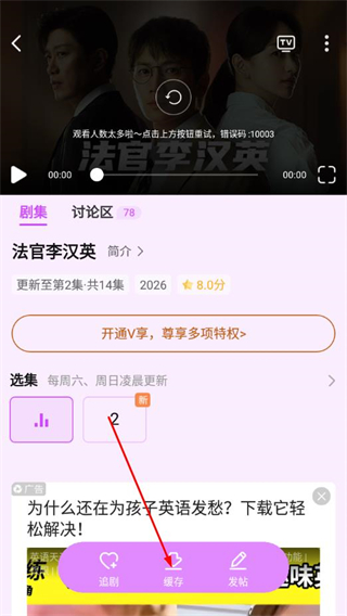 3、在底部操作栏里,点击缓存按钮,即可进行剧集的缓存操作。