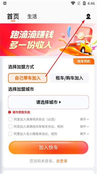 1、在滴滴车主页面,点击右上角的个人中心图标,进入登录入口。