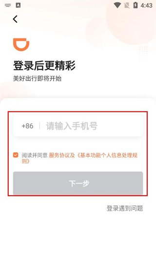 2、在登录页面,输入手机号并勾选服务协议,点击下一步。