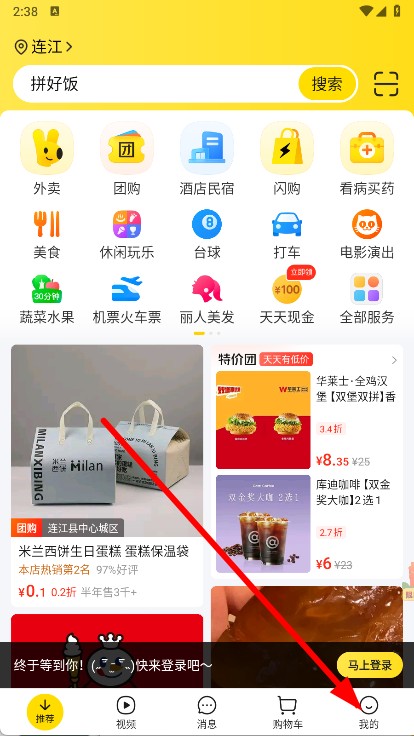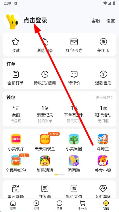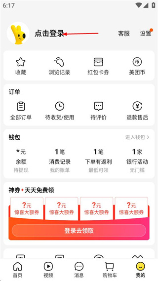 2、在个人中心界面中,找到并点击点击登录选项,进入美团登录页面。