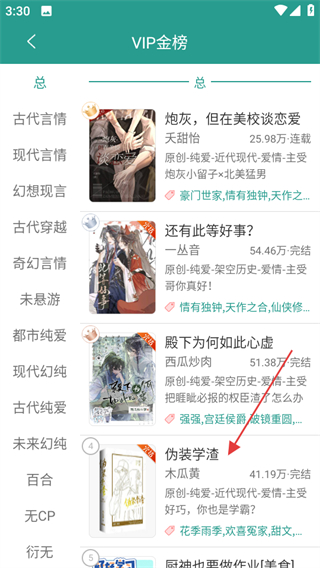 2、在VIP金榜页面,选择书籍伪装学渣,进入书籍详情页。