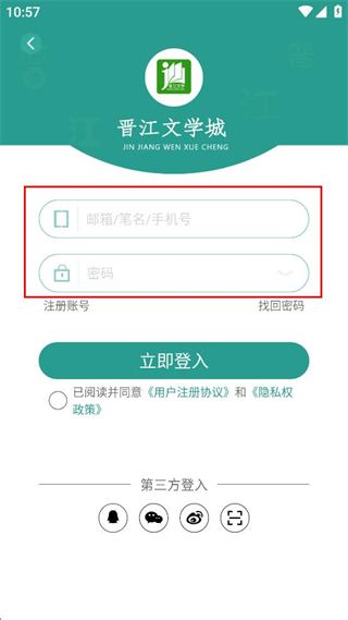 3、进入登录界面后,在对应输入框填写邮箱笔名手机号及密码等登录信息。