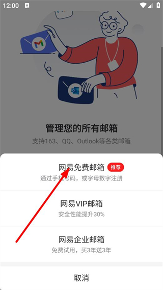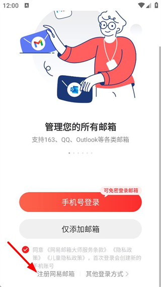1、在APP登录选择页面,点击注册网易邮箱,进入邮箱选择页面。