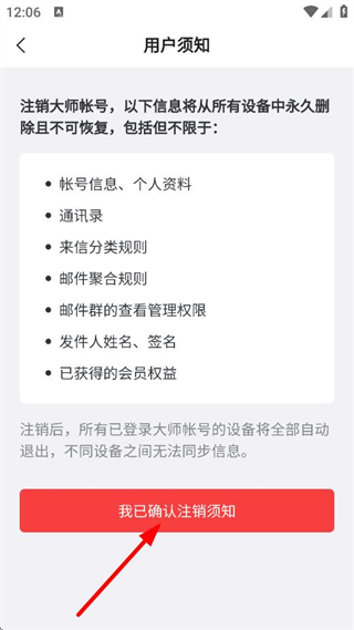4、在用户须知页面,点击我已确认注销须知,完成大师账号注销。