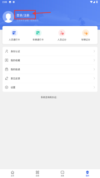 2、在个人中心页面,点击登录/注册选项,进入登录注册界面。
