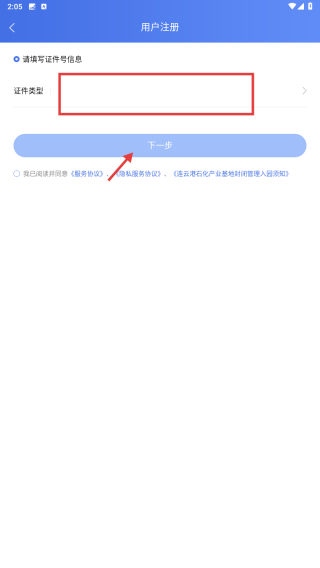 4、在用户注册页面,选择证件类型后点击下一步,按提示完成账号注册操作。