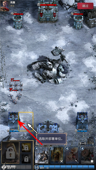 2、在战斗部署阶段,需关注选取并部署单位提示,从底部兵种卡牌中选择合适单位,部署到指定区域,制定攻防策略。