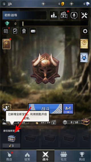 3、在初阶战场界面,留意新任指挥官宝箱入口,获取钥匙后及时开启宝箱,可持续获得卡牌等资源,助力战力提升。