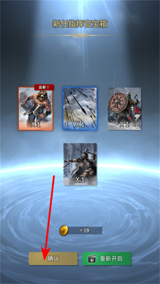 4、开启新任指挥官宝箱后,会获得卡牌、金币等奖励,点击确认按钮领取奖励,这是初期积累资源的关键操作。