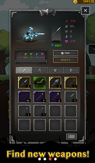 4、在装备界面中,点击SELECT按钮选择武器,可查看武器的攻击力、暴击率等属性,合理搭配武器是提升骑士战力操作。