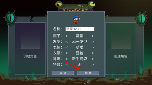 1、在角色创建界面,自定义名称、帽子角色外观后,点击按钮,完成创建是进入游戏世界的基础操作。