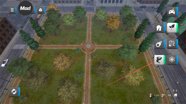 1、选择右侧的灾害工具如龙卷风、核爆等,对城市区域如公园、街道释放灾害。