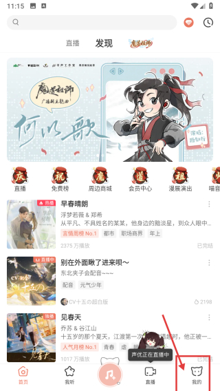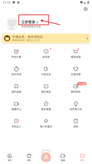 1、打开音频类APP首页,点击底部我的选项,进入个人中心页面。
