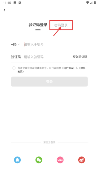 3、在登录方式选择页面,点击密码登录选项,进入密码登录信息填写页面。