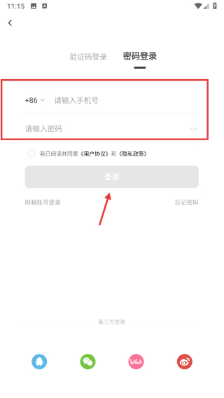 4、在密码登录页面,填写手机号及密码,勾选同意协议后点击登录按钮,完成账号登录操作。