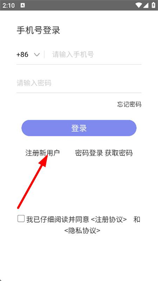2、在手机号登录页面,点击注册新用户,进入新用户注册页面。