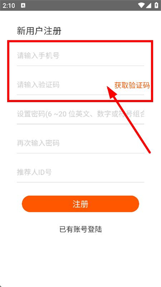 3、在新用户注册页面,输入手机号后点击获取验证码。