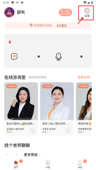 1、打开心理咨询类APP,点击右上角设置图标,进入设置页面。