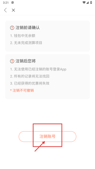 4、在注销确认页面,确认钱包无余额、无未完成测算项目后,点击注销账号按钮,完成账号注销操作。