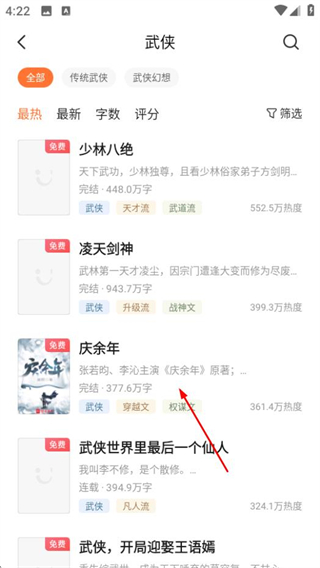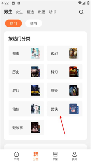 2、在分类页面,选择武侠类别,进入武侠小说列表页面。