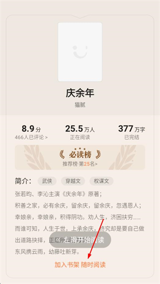 3、在列表页面,点击心仪小说如庆余年,进入小说详情页面。