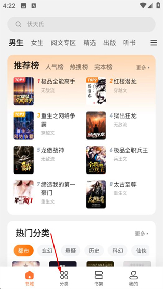 1、打开多看,在首页点击分类,进入书籍分类页面。