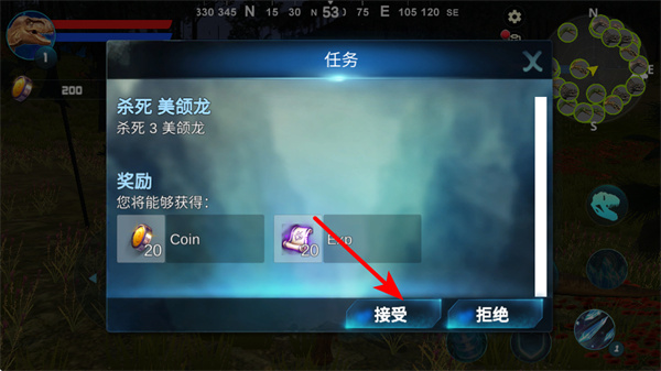 1、在任务界面,点击接受按钮领取杀死美颌龙任务,完成任务可获取金币和经验奖励,这是快速提升等级。
