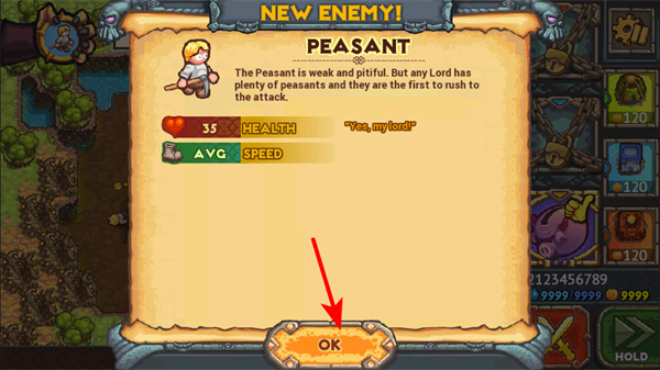 2、遇到NEW ENEMY提示时,点击OK按钮确认,了解敌人属性如PEASANT的生命值、速度等,制定防御策略提供依据。