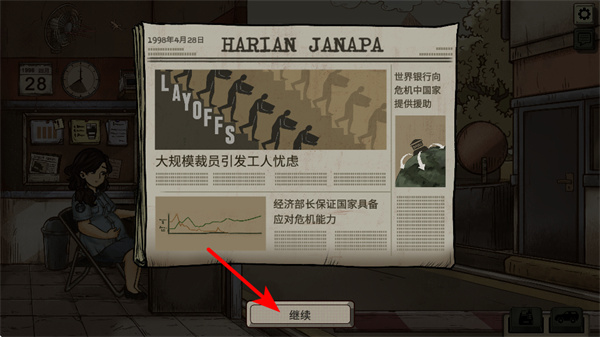 1、在游戏开局,点击继续按钮推进剧情,这是开启游戏流程的关键操作,点击后可进入收费站的经营场景。