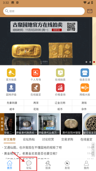 1、打开古泉收藏类APP首页,点击底部论坛选项,进入论坛页面。