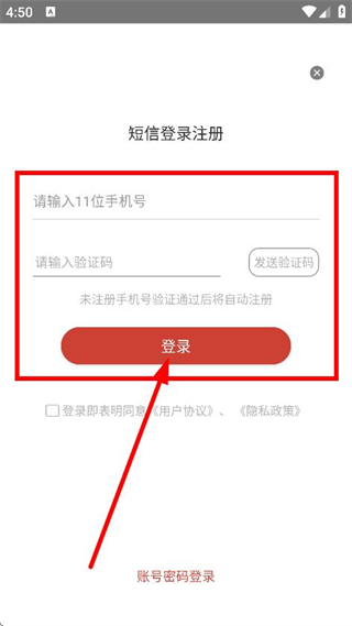 4、在短信登录注册页面,输入手机号并输入验证码后,点击登录,完成账号登录操作。