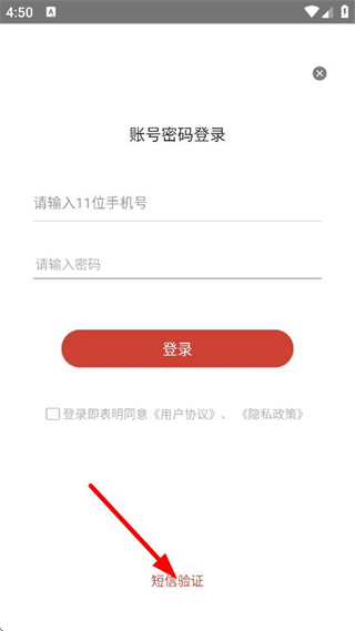 3、在登录方式选择页面,点击短信验证,进入短信登录注册页面。