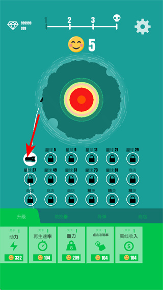 3、点击重力升级按钮,调整物体的重力属性,重力影响物体的运行轨迹和得分效率,合理升级可优化游戏体验。