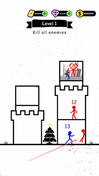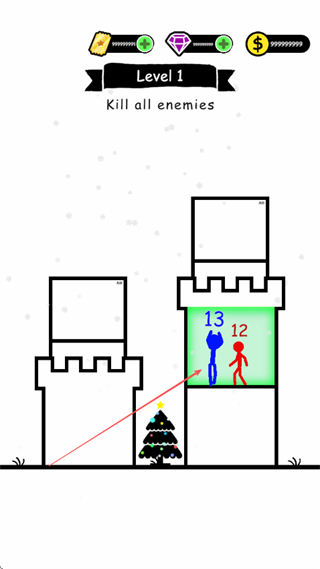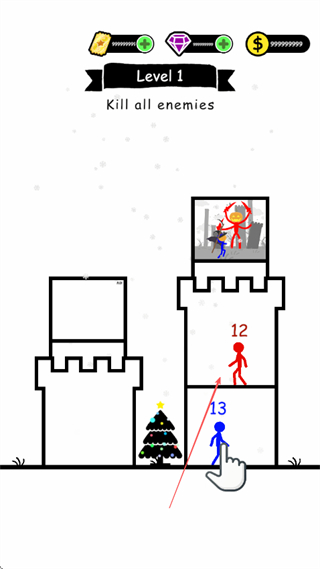 1、在Level1中,目标是消灭所有敌人,点击蓝色火柴人,使其移动到敌人所在的楼层。