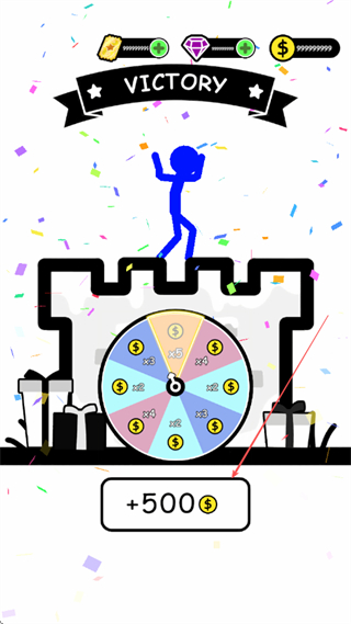 4、通关后获得金币奖励,可参与转盘抽奖或直接领取+500$的奖励,继续挑战下一关。